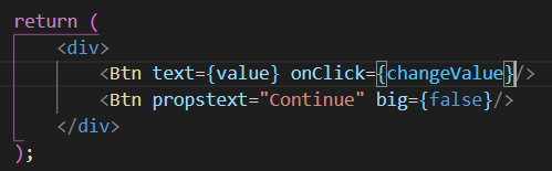React ๋ ์๋์ผ๋ก ๋ด๊ฐ <Btn propstext="Continue" /> ์ฌ๊ธฐ์ ๋ฃ๋ ๋ชจ๋ property(prop)๋ค์