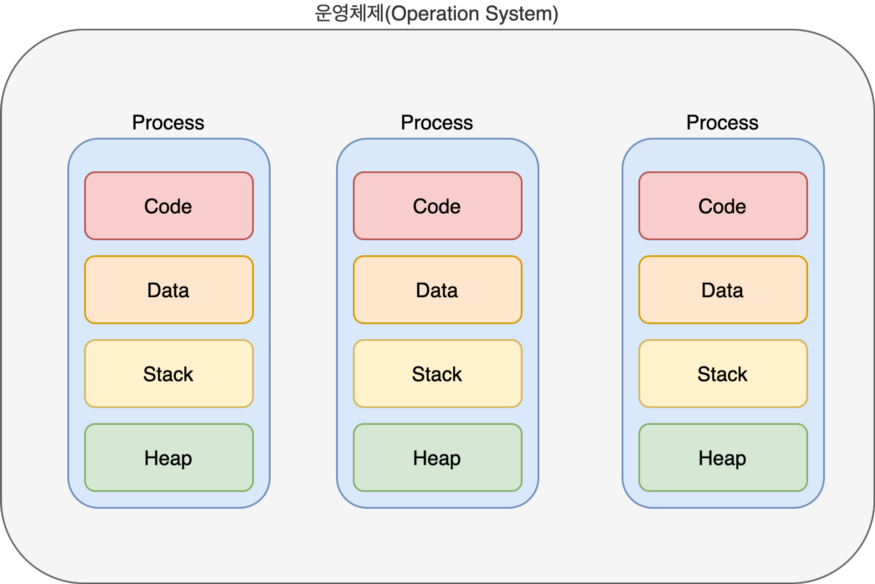 프로세스는 운영체제로부터 시스템 자원을 할당받는다. 이 때 운영체제는 프로세스마다 각각 독립된 메모리 영역을 할당해준다. 각각 "독립된" 메모리 영역을 할당해주기 때문에 프로세스는 다른 프로세스의 변수나 자료에 접근할 수 없다.