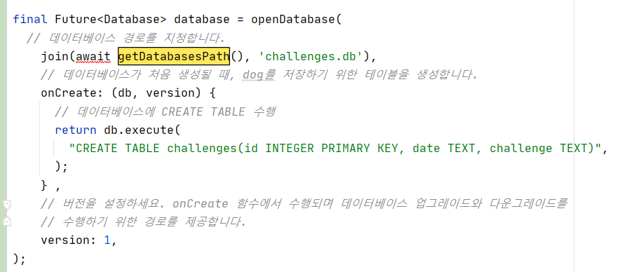 getDatabasesPath๋ sqflite์ ๋ผ์ด๋ธ๋ฌ๋ฆฌ์ด๊ธฐ ๋๋ฌธ์ ์ง์ ์ง๋ ๋ถ๋ถ์ด ์๋๋ค.