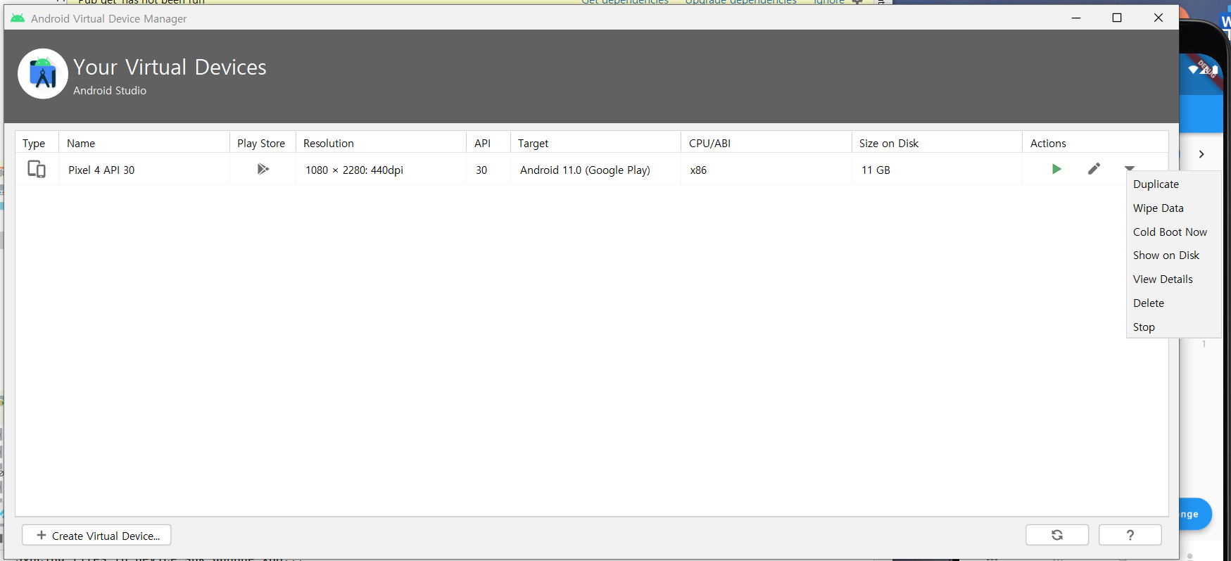 🔥/Project👨💻 [Android Studio] 에뮬레이터 작동 안 될 때 by narang111 2022. 9. 12. 방법 1️⃣ 에뮬레이터를 종료하고 Cool Boot Now를 눌러준다. 방법 2️⃣ Wipe Data로 한 번 초기화 해주고 다시 빌드! 공유하기 게시글 관리 공부기록 '🔥 > Project👨💻' 카테고리의 다른 글 [Flutter] SQLite 연동하다 생긴 일 (feat. await async) (0) 2022.09.12 [Flutter] 실시간데이터베이스 CRUD (0) 2022.09.09 [Flutter] error: Target of URI doesn't exist: 'package:flutter_clean_calendar/flutter_clean_calendar.dart'. 오류 (0) 2022.09.08 [Flutter] uses-sdk:minSdkVersion 16 cannot be smaller than version 19 declared in library 오류 (1) 2022.09.05 [Flutter] No connected devices found; please connect a device, 오류 (0) 2022.09.03 관련글 [Flutter] SQLite 연동하다 생긴 일 (feat. await async) [Flutter] 실시간데이터베이스 CRUD [Flutter] error: Target of URI doesn't exist: 'package:flutter_clean_calendar/flutter_clean_calendar.dart'. 오류 [Flutter] uses-sdk:minSdkVersion 16 cannot be smaller than version 19 declared in library 오류