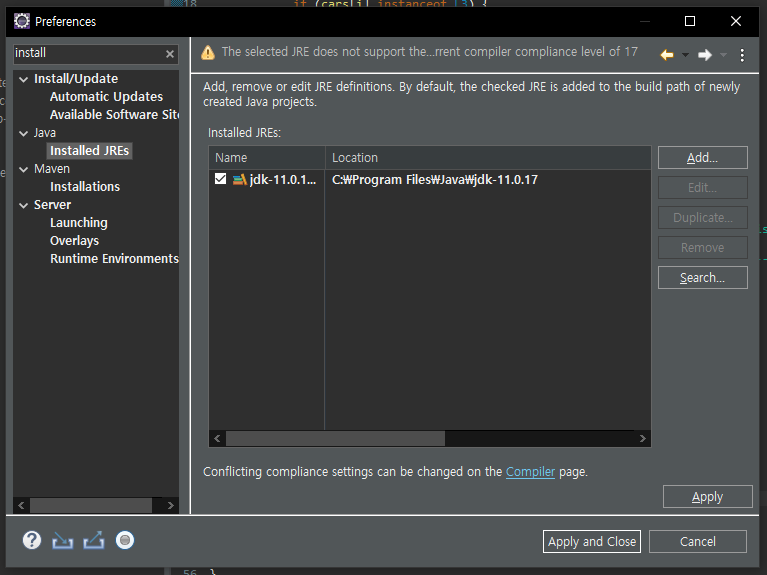 preferences > installed jres에서 jdk 11.0.17 로 바꾸어주기