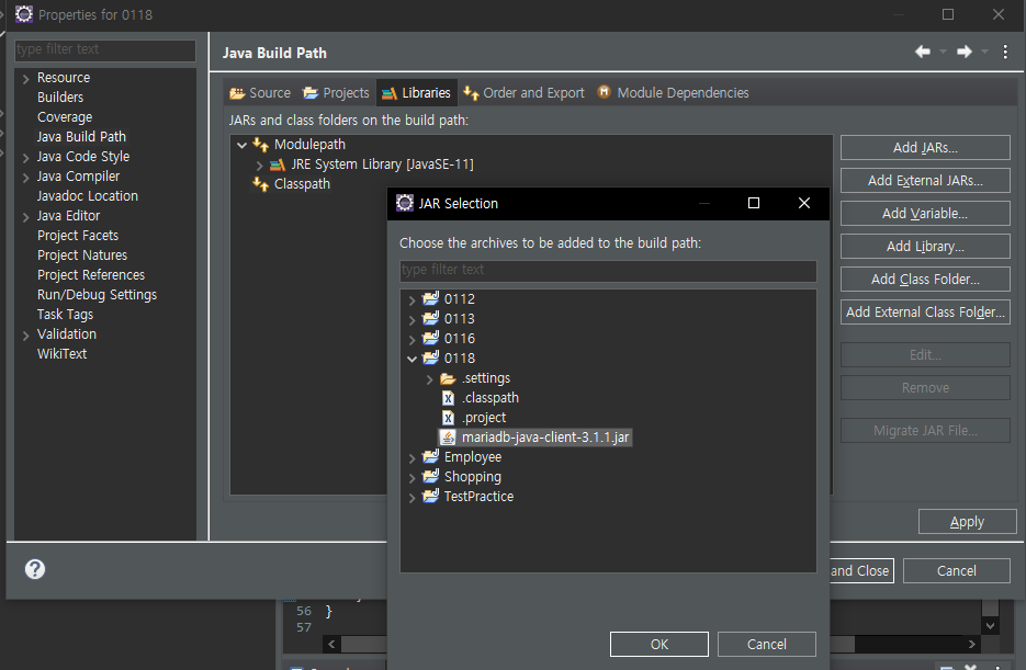 Libraries 탭 이동 > 목록에서 class path 누른 후 Add JARs > 끌어다놓은 jar 선택
