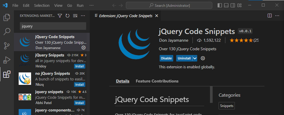 확장 메뉴에서 javascript es6과 jquery를 인스톨해줌