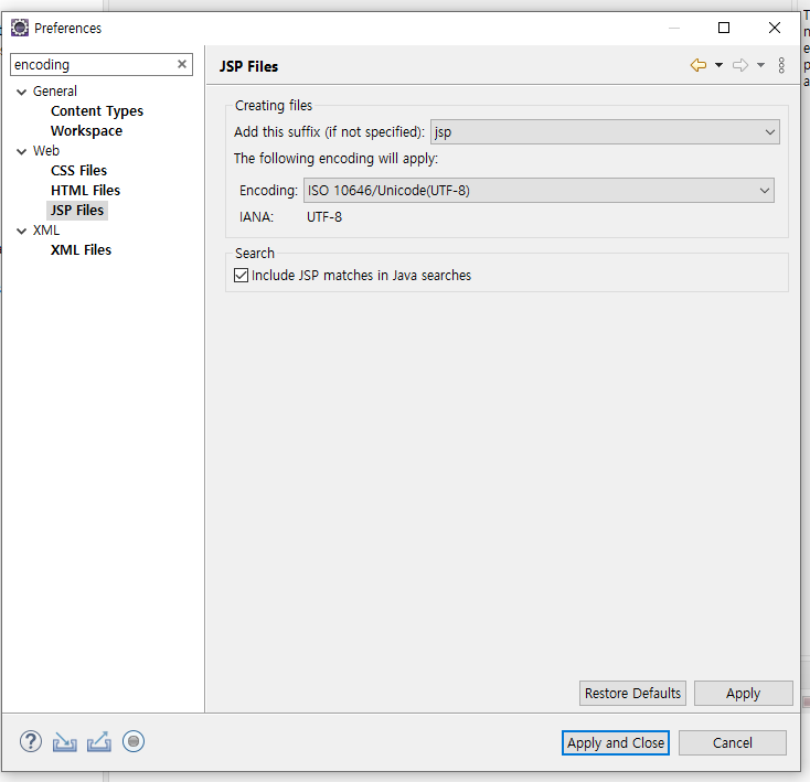 window preference에서 encoding 설정을 해준다 utf-8로!