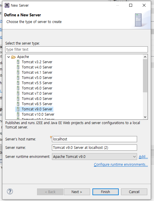 자신이 깔았던 톰캣버전을 선택해주고 next를 눌러줌