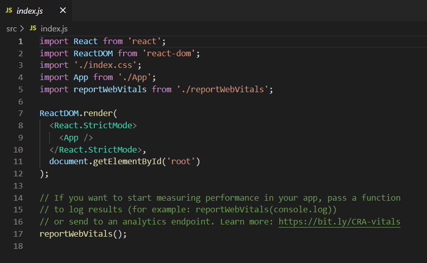 index.html์์ ์ฐ๋ฆฌ๊ฐ ์ ๊ฒฝ ์ธ ๋ถ๋ถ์ div ํ๊ทธ์์ id="root" ์ธ ๋ถ๋ถ์ด๋ค.