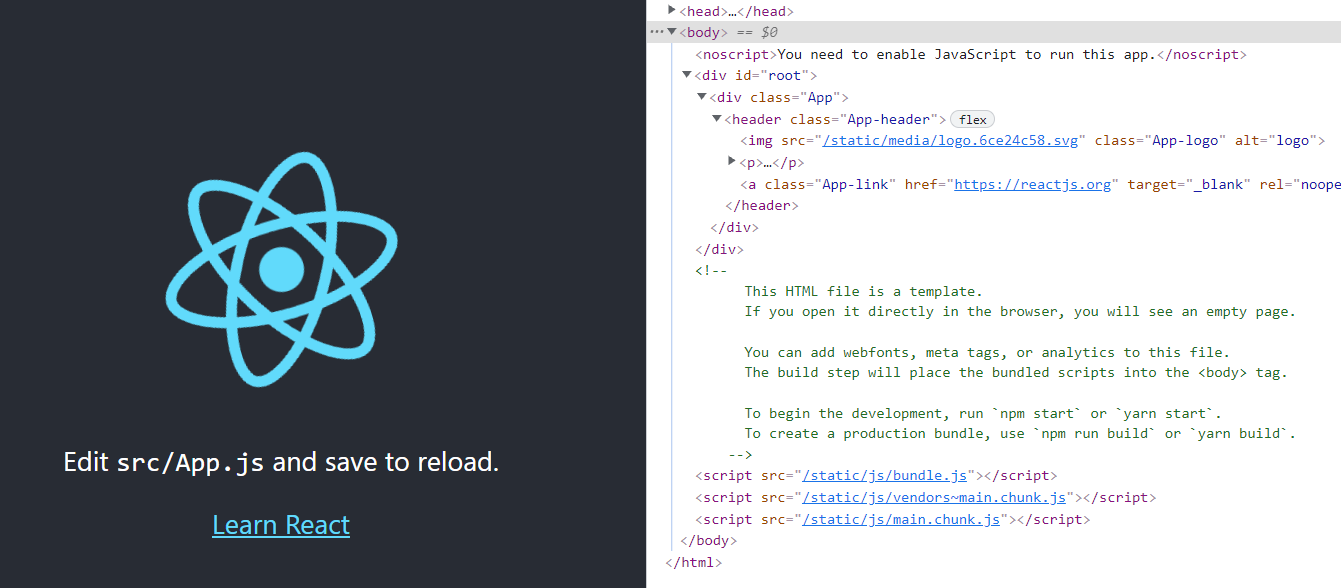 <APP /> ์ด๋ผ๊ณ ์ ํ์๋ ๋ถ๋ถ์ ๋ฆฌ์กํธ๋ฅผ ํตํด ๋ง๋ ์ฌ์ฉ์ ์ ์ ํ๊ทธ ์ฆ ์ปดํฌ๋ํธ์ด๋ค. ์ง๊ธ์ create-react-app ์ด ์ํ๋ก ๋ง๋ ์ปดํฌ๋ํธ์ด๋ค.