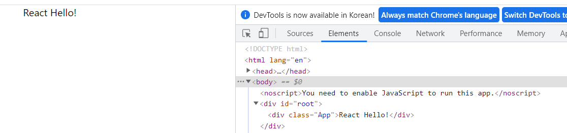create-react-app์ด ๊ธฐ๋ณธ์ค์ ํ ์น ๋ธ๋ผ์ฐ์ ์ html์ ๋ณด๋ฉด id๊ฐ root ์ธ ํ๊ทธ ์์ชฝ์ react๋ฅผ ํตํด์ ๋ง๋ ํ๊ทธ๋ค์ด ๋ค์ด๊ฐ ๊ฒ์ ๋ณผ ์ ์๋ค.