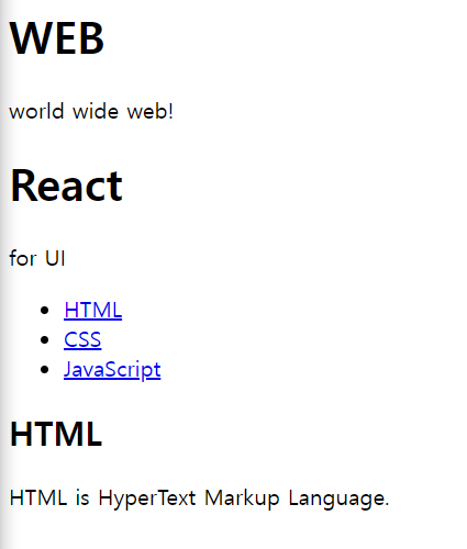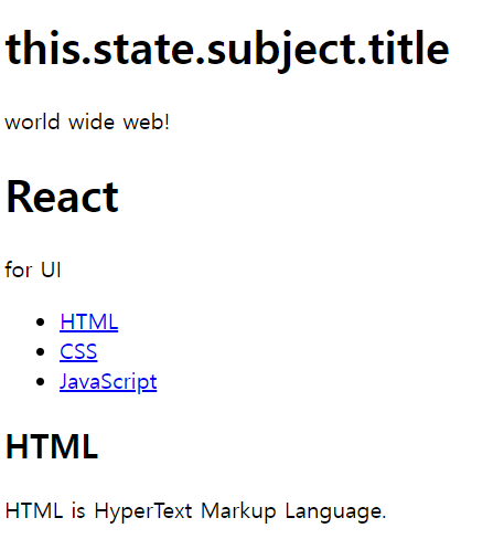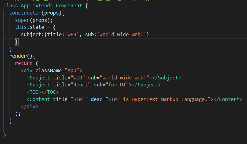 subject props ๊ฐ์ผ๋ก ๋ค์ ๊ฐ์ฒด๋ฅผ ์ฃผ๋๋ฐ ๊ทธ ๊ฐ์ฒด์ title์ WEB sub๋ฅผ World Wide Web์ด๋ผ๊ณ ๊ฐ์ ์ค state ๋ฅผ ๋ง๋ ๊ฒ์ด๋ค.