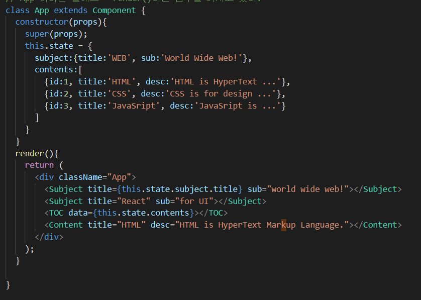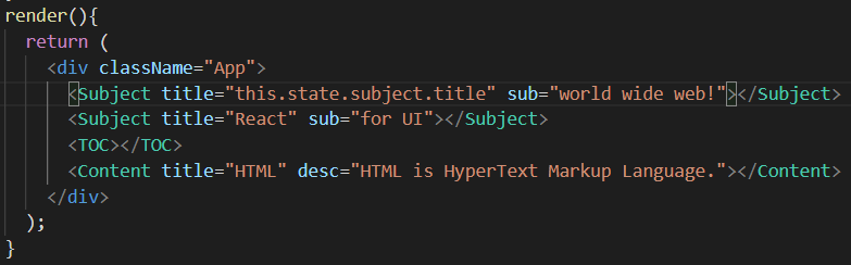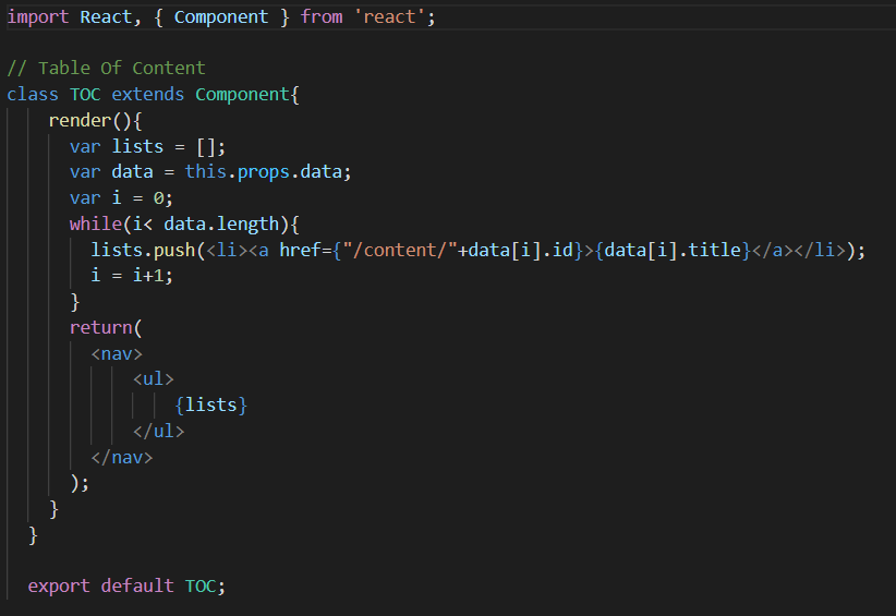 4) ์ด ๋ฐฐ์ด์ TOC์ ์ฃผ์ ํ๊ณ ์ถ๋ค๋ฉด data๋ผ๋ props๋ก this.state.contents๋ฅผ ๋ฃ์ด์คฌ๋ค.