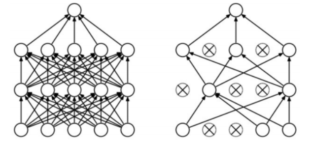 - ์ ๊ฒฝ๋ง ๋ชจ๋ธ์ด ๋ณต์กํด์ง๋ neuron์ ์ฐ๊ฒฐ์ ์์๋ก ์ญ์ ํด ์ ํธ๋ฅผ ์ ๋ฌ ๋ชปํ๋๋ก ์ค์